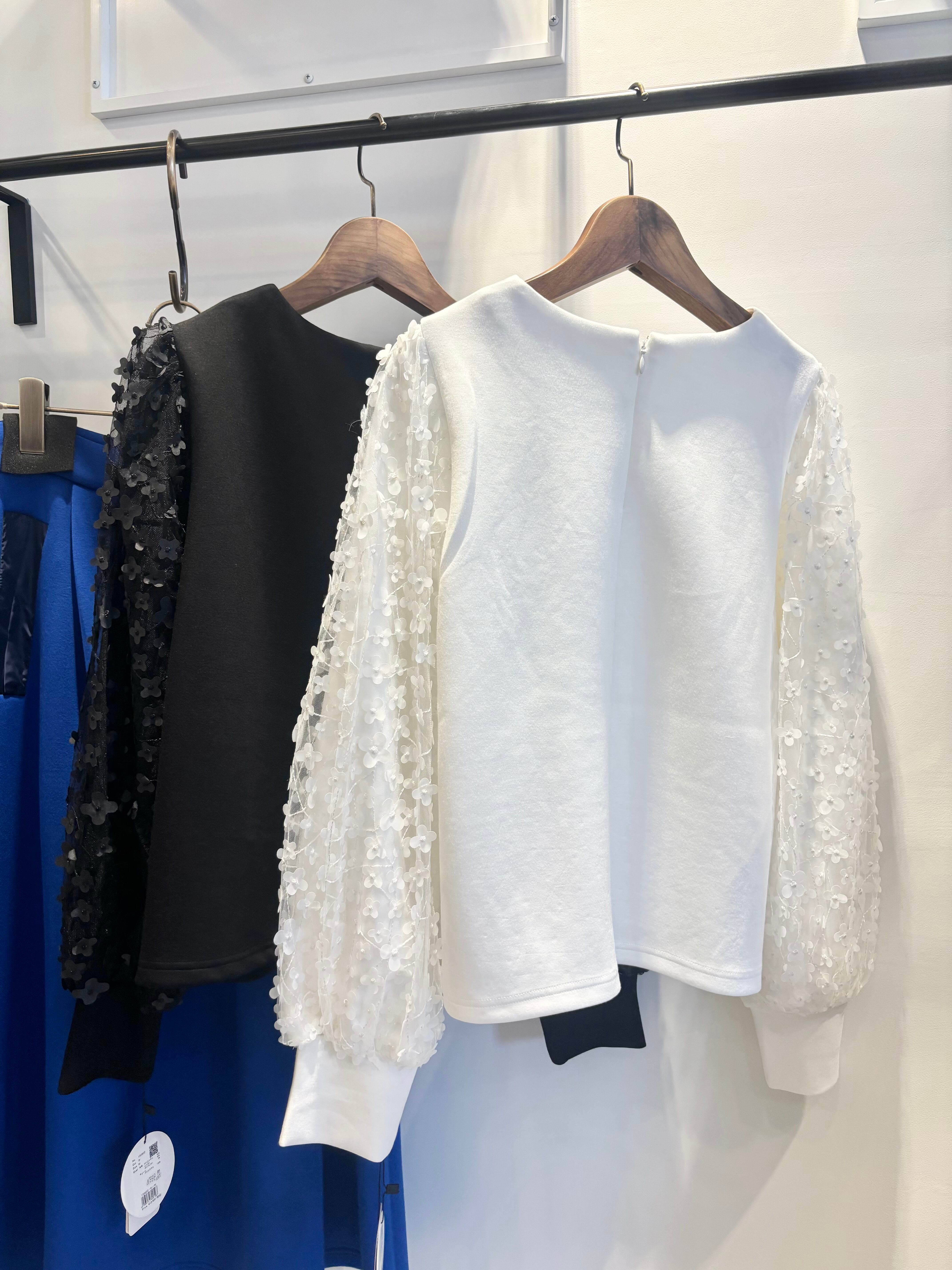 袖にふわりと重ねられたチュールには、刺繍や異素材のフラワーモチーフが散りばめられ、