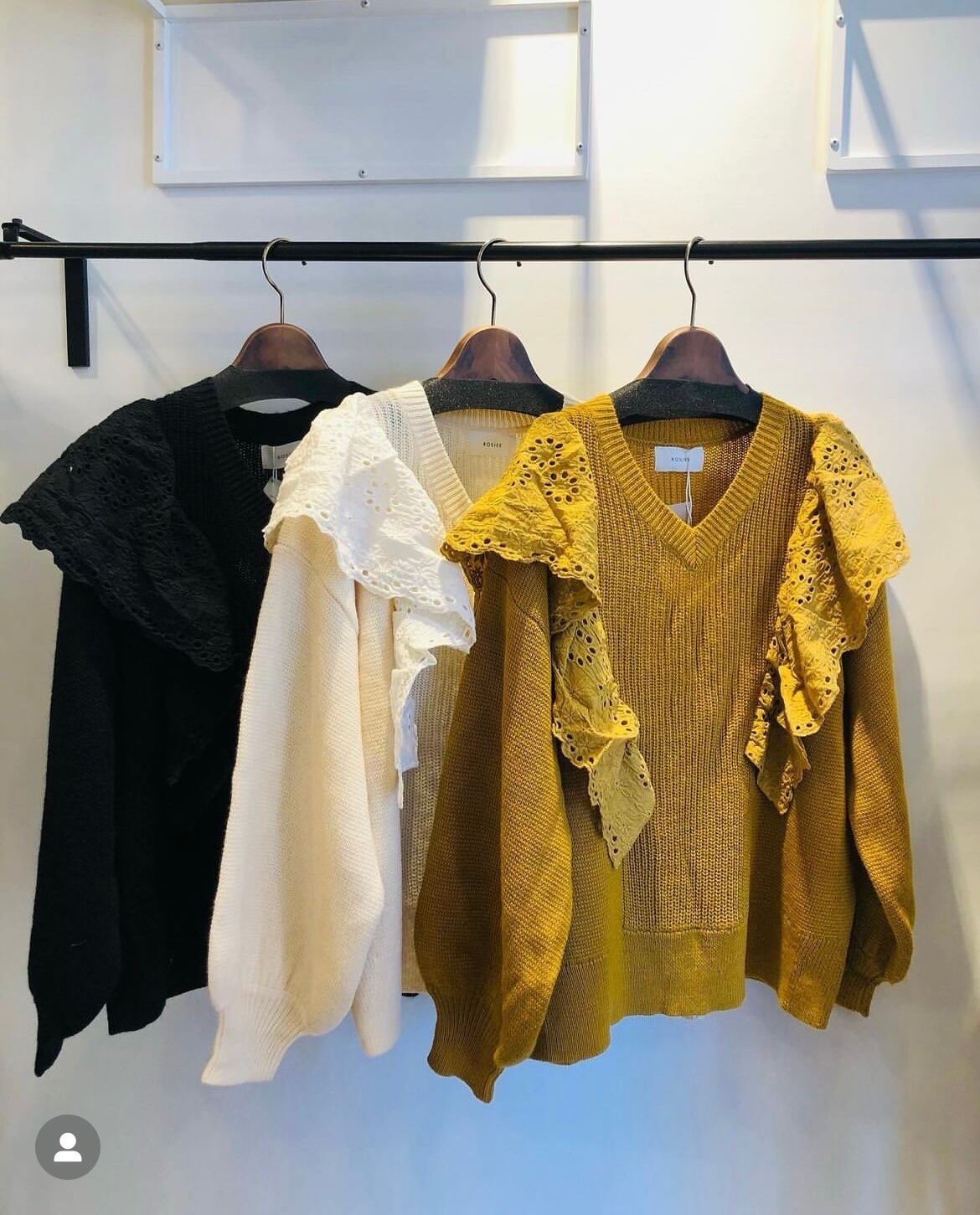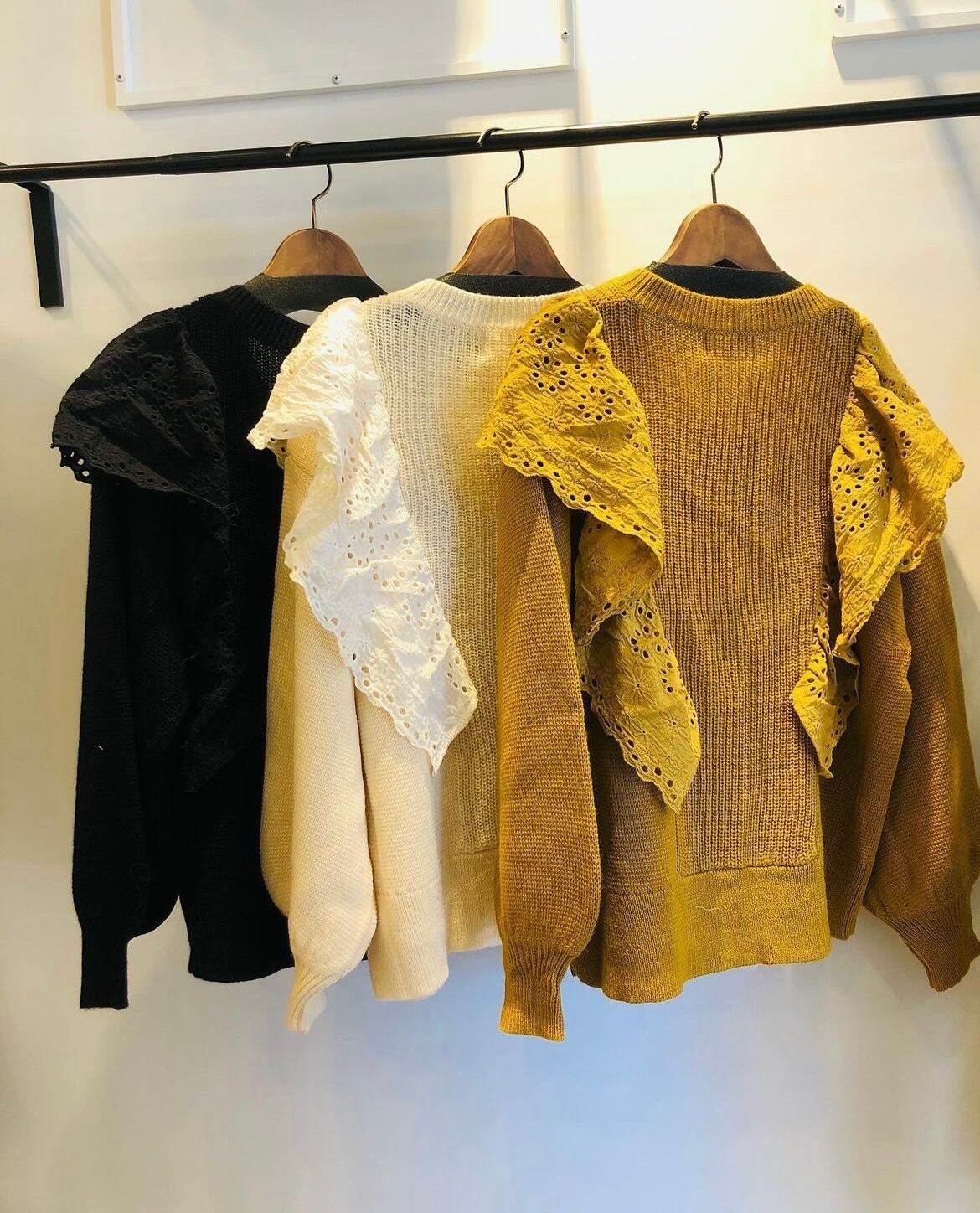 畦編みとミラノリブを組み合わせたざっくりとしたニットはボリューム感のある袖とレースの甘さ、Vネックの締まりのあるデザインで