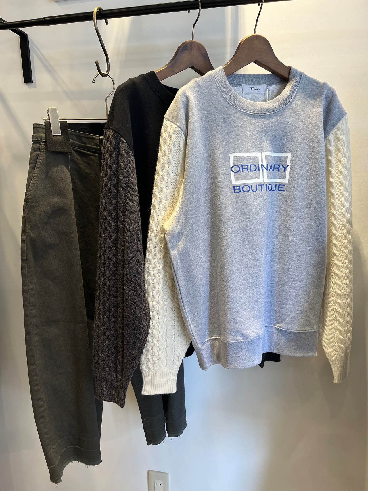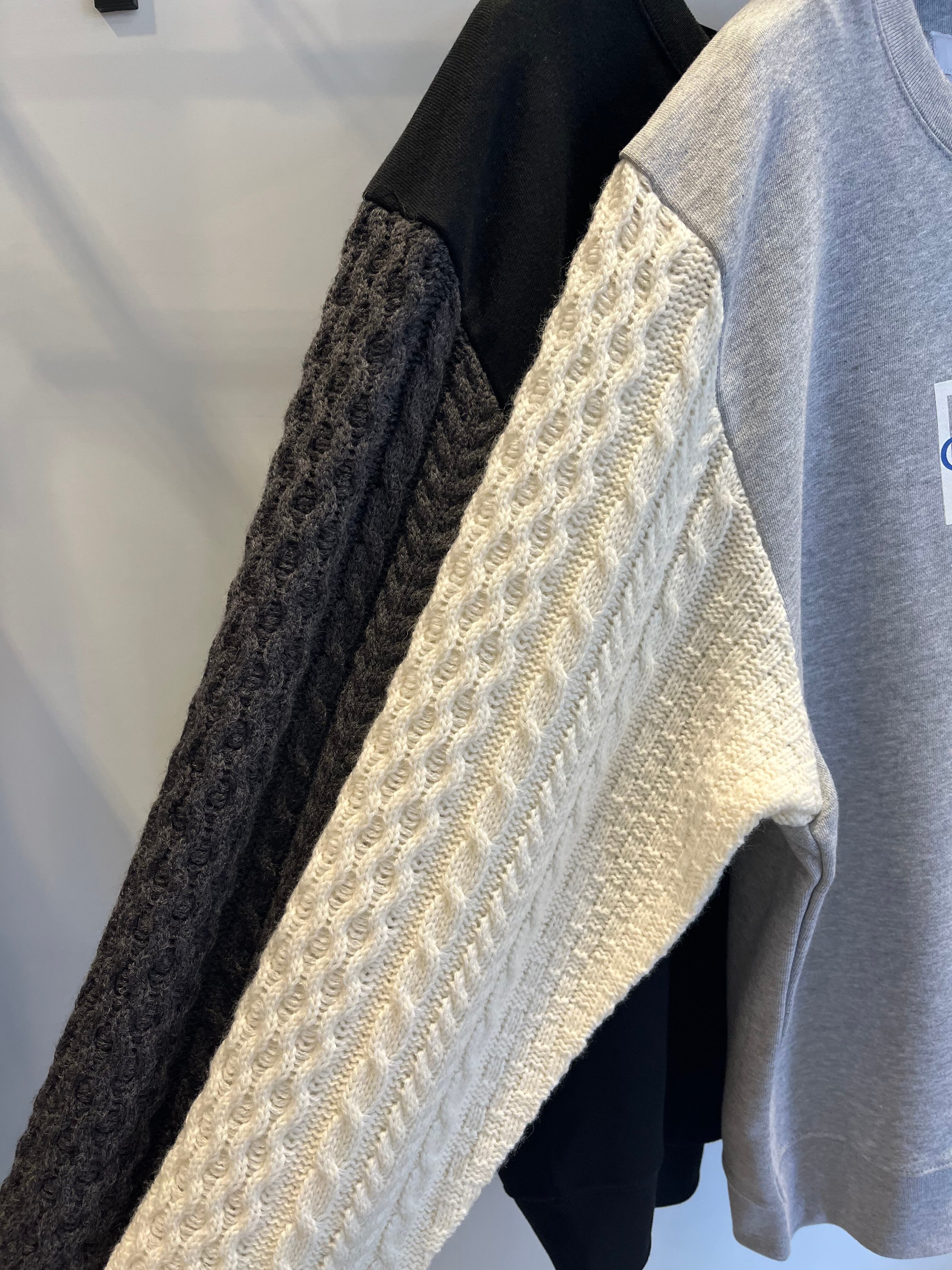 クルーネックのスウェットシャツに縄編みのニット袖をドッキングさせたリメイク風アイテム。
